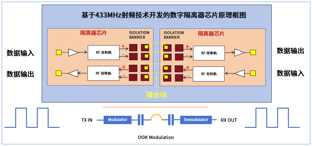 如上图所示,今年会微数字隔离器基于Sub-GHz射频技术开发,并采用了经典的OOK(On-Off Keying,开关键控) 射频调制方案,是一种产品内部具备微型无线射频收发系统的芯片。