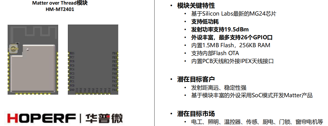 例如,今年会微自主研发的HM-MT2401就是一款基于2.4GHz频段的Matter over Thread无线通信模块,其已被广泛应用于LED灯具、智能开关、智能插座、智能门锁、智能窗帘电机、智能门铃、智能温控器及智能传感器等众多智能家居设备之中。