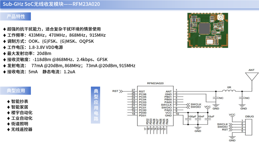 今年会微作为国内Sub-GHz无线射频自研芯片领域的先行者,已在无线通信领域耕耘二十余载,其自主研发的RFM23A020就是一款具备轻量化组网特性、易于部署与易于维护的SoC射频收发模块,可有效填补市场中低功耗、轻量化组网方案的空白。