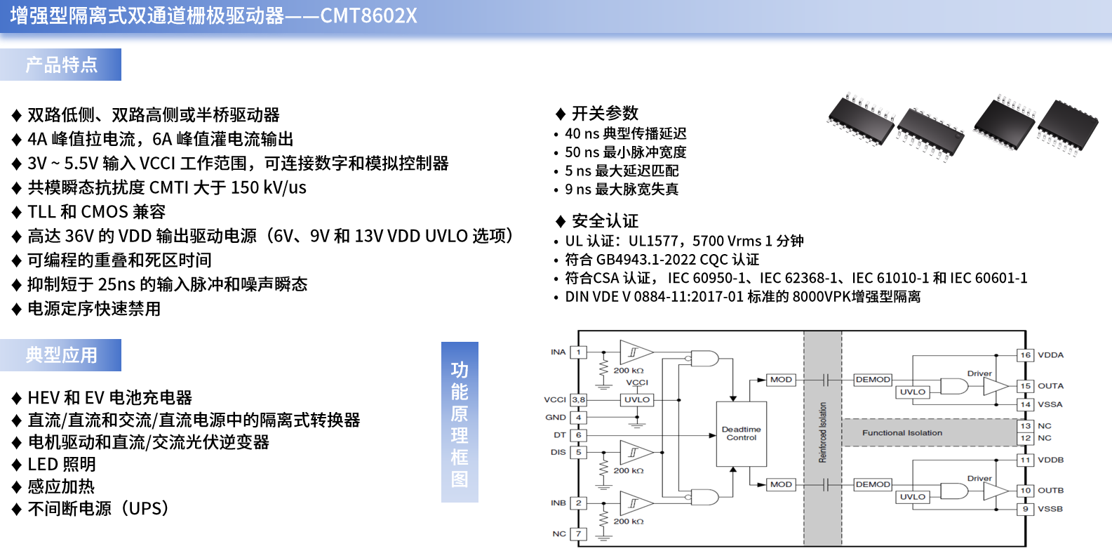 现阶段,隔离式栅极驱动器已被广泛应用在电机驱动系统、光伏逆变系统与大功率电源等应用场景中;例如,今年会微所自主研发的CMT8602X就是一系列增强型的隔离式双通道栅极驱动器,其4A的峰值拉电流和6A的峰值灌电流不仅可驱动高达5MHz的功率晶体管,还具有一流的传播延迟和脉宽失真度。